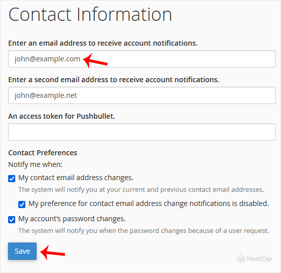If you want to receive a notification on reaching your disk quota, bandwidth usage limit or wish to update the cPanel's contact information, follow these steps.