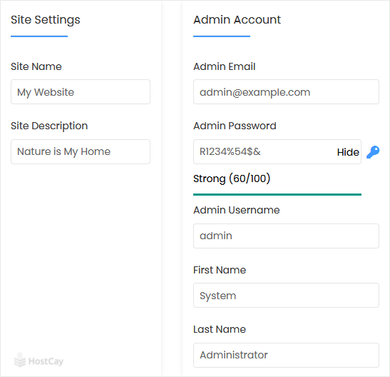 8. Under the Admin Account field, enter the following information: