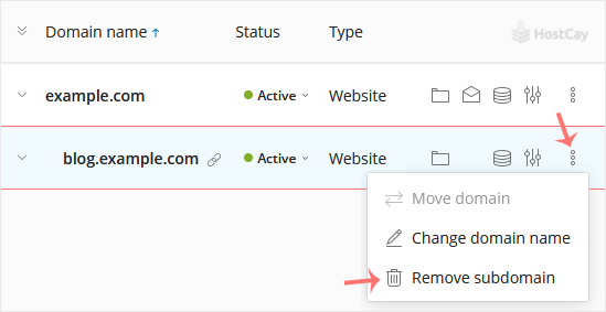 3. Under the list of Domain names, click on the More icon  in front of the subdomain and select Remove subdomain.
